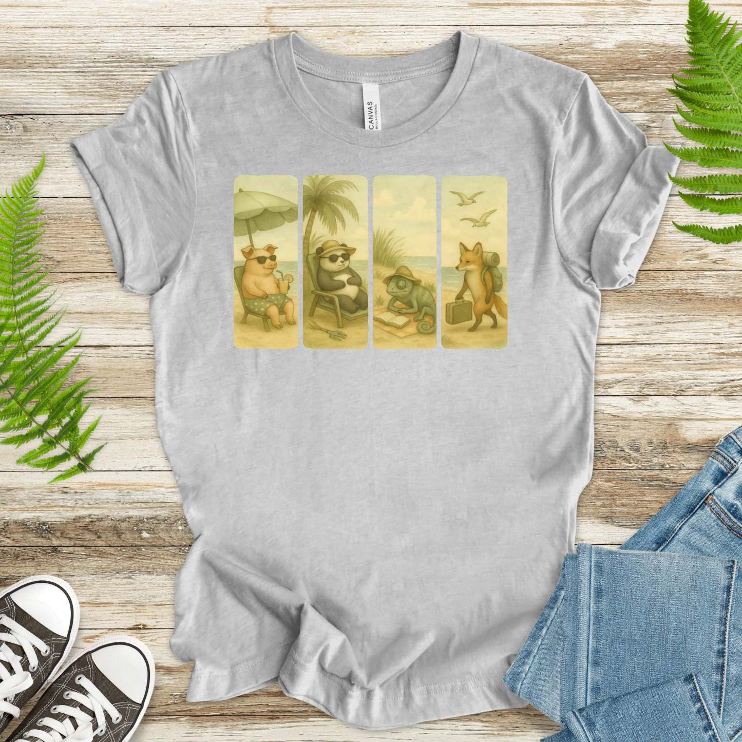 Beach Animal Strips T-Shirt – Cute Panda, Fox, Pig & Chameleon Vacation Tee
